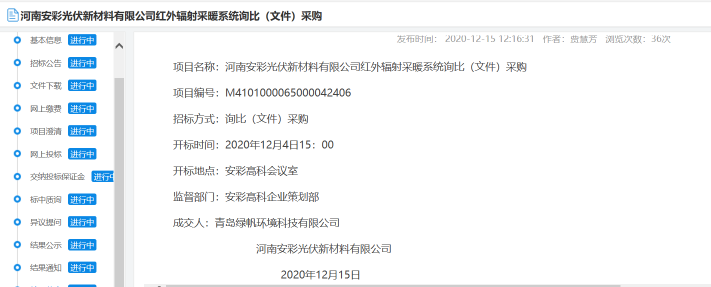 2020年12月15日,我司收到河南安彩公司关于燃气红外辐射采暖项目的中标通知书。河南安彩光伏公司隶属河南省国资委,是国家重点企业,在新能源行业有着举足轻重的作用。为了满足业主采暖需求,急客户之所急,我司将选派精兵强将进行攻坚。力保20天内完成四大车间的采暖改造工程。