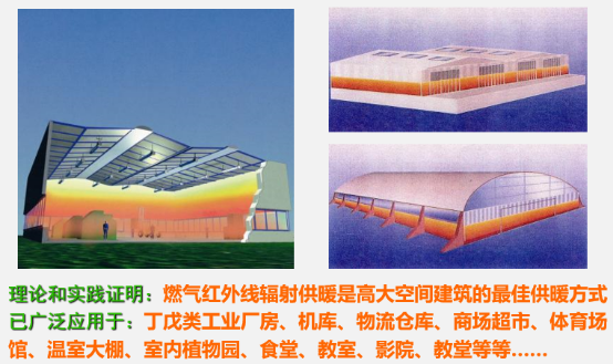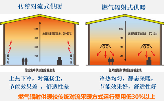 高大建筑物内用传统的散热器(暖气片)作放热设备,大跨度房间难布置。有的车间墙上放满散热器,靠自然对流放热为主的这种供暖方式造成上下温度梯度大,达0.5~1.0℃/m,使房顶空气温度高达32℃,但2m以下人停留的工作区空气温度分布不均,有的地方只有3℃~5℃。供热系统不是为建筑、为室内空气服务的,而应以人为本,除满足生产工艺要求外,以人员舒适与降低能耗为主要目标。用散热器加暖风机或集中空气处理送暖风方式,既占建筑面积,又会造成扬灰,影响卫生和人体健康,在某些场合还被禁用。至于敞开、半敞开场地的供暖,使用燃气辐射器更有无可比拟的优点。